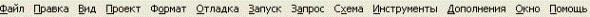 Главное меню (рис 1.3), как и во всех приложениях Microsoft, представляет собой линейку раскрывающихся меню. Оно содержит следующие основные команды: File (Файл), Edit (Правка), View (Вид), Project (Проект), Format (Формат), Debug (Отладка), Run (Запуск), Query (Запрос), Diagram (Диаграмма), Tools (Сервис), Add-Ins (Надстройки), Window (Окно), Help (Справка).